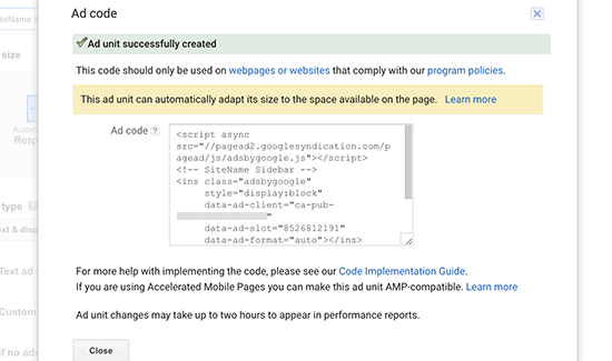 Once you’re through with this setup, simply click on Save and obtain the code button. You’ll be prompted with a message “Ad successfully created”, and you’ll also see the Ad code.