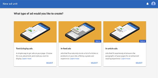 This will bring you to a create new ad screen, and you’ll be asked to settle on a billboard type. You’ll select from ‘text and display ads’, ‘In-feed ads’, and ‘In-article ads’.